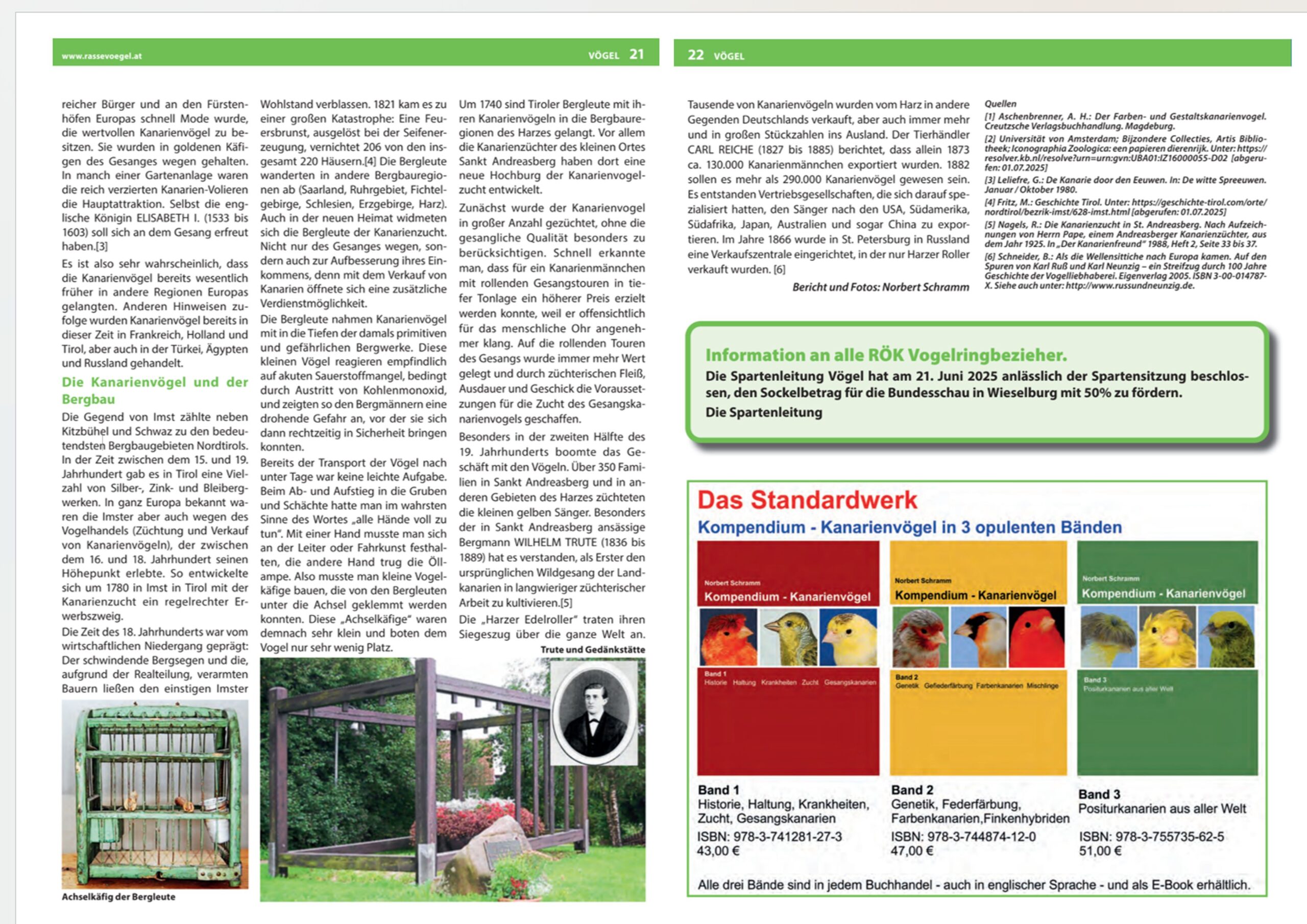 [5] Nagels, R.: Die Kanarienzucht in St. Andreasberg. Nach Aufzeichnungen von Herrn Pape, einem Andreasberger Kanarienzüchter, aus dem Jahr 1925. In „Der Kanarienfreund“ 1988, Heft 2, Seite 33 bis 37.