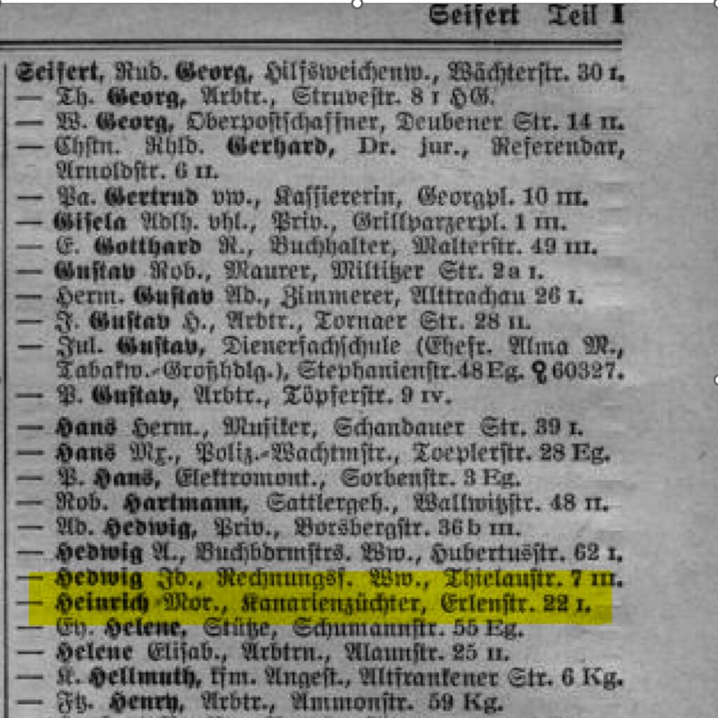 Offenbar hat Heinrich Seifert weiterhin Kanarien gezüchtet, denn in seinem Eintrag im Dresdner Adressbuch von 1932 ließ er „Kanarienzüchter“ eintragen. Sein letzter Wohnsitz war demzufolge in der Erlenstraße 22, 1. Etage, in Dresden-Neustadt.
