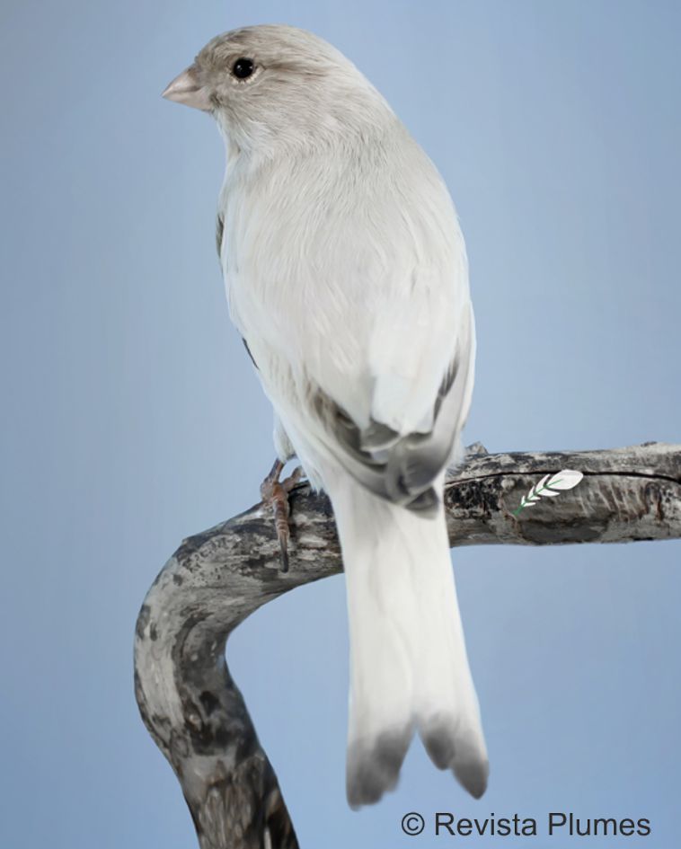 Das Körpergefieder und die Schwung- und Schwanzfedern sind einheitlich perlgrau. Eine schwach erkennbare perlgraue Melaninzeichnung ist auf dem Rücken zulässig, ist jedoch nur bei Weißgrundigen und bei Mosaikvögeln außerhalb der Mosaikareale sichtbar. Nur die Spitzen der Schwung- und Schwanzfedern und die Daumenfedern (Alulae) sind dunkelgrau bis schwarz. Die Stirn besitzt dunkles Melanin (je dunkler, desto besser wird sie bewertet), Scheitel und Wangenstreif sind mit dunkelgrauem Melanin durchsetzt und bilden eine Maske.
