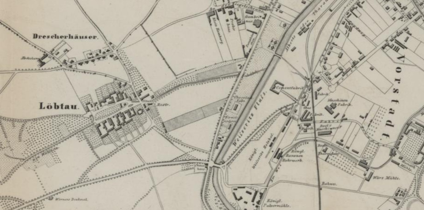 Löbtau near Dresden was a small village on the outskirts of Dresden. Because of the widespread cattle breeding, Löbtau used to be mockingly called ‘Kuh-Löbte’ (Cow-Löbte). The village green, which stretched between Tharandter Street and Zwickauer Street, served as pastureland. Whilst the village had only 163 inhabitants in 1834, the population multiplied in the following decades, and it was incorporated into the city of Dresden in 1903.